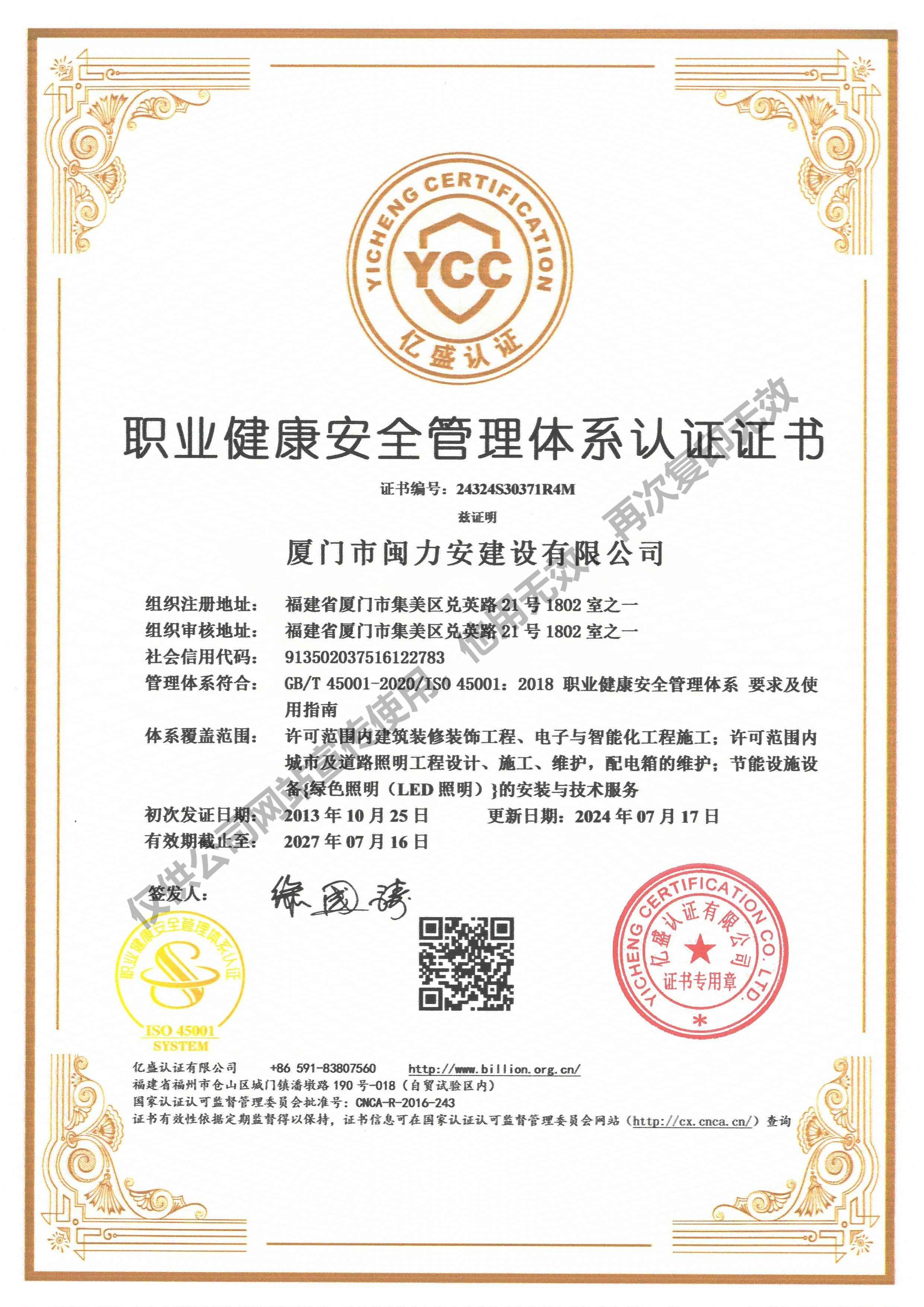 廈門市閩力安建設(shè)有限公司成立于2003年,公司取得市政公用工程施工總承包貳級、建筑裝修裝飾工程專業(yè)承包壹級、城市及道路照明工程專業(yè)承包壹級、電子與智能化工程專業(yè)承包貳級、消防設(shè)施工程專業(yè)承包貳級、電力工程施工總承包叁級、建筑機(jī)電安裝工程專業(yè)承包叁級、輸變電工程專業(yè)承包叁級、環(huán)保工程專業(yè)承包叁級、照明工程設(shè)計專項甲級、建筑裝飾工程設(shè)計乙級、施工勞務(wù)等資質(zhì)的綜合型企業(yè),公司于2013年通過了ISO9001質(zhì)量體系認(rèn)證,ISO14001環(huán)境管理體系認(rèn)證,OHSAS18001職業(yè)健康安全管理體系認(rèn)證。